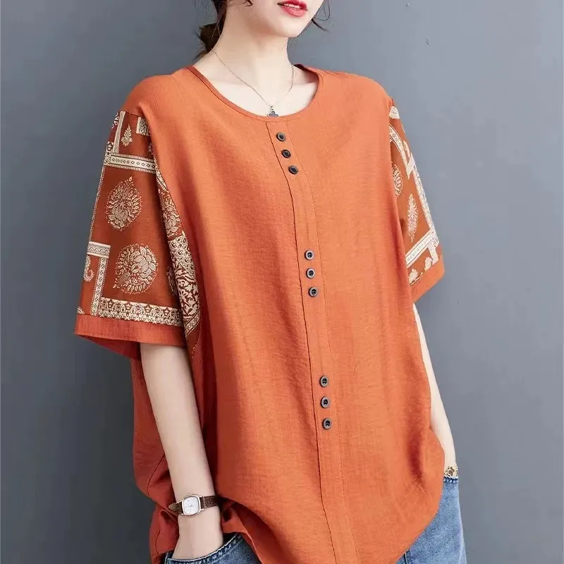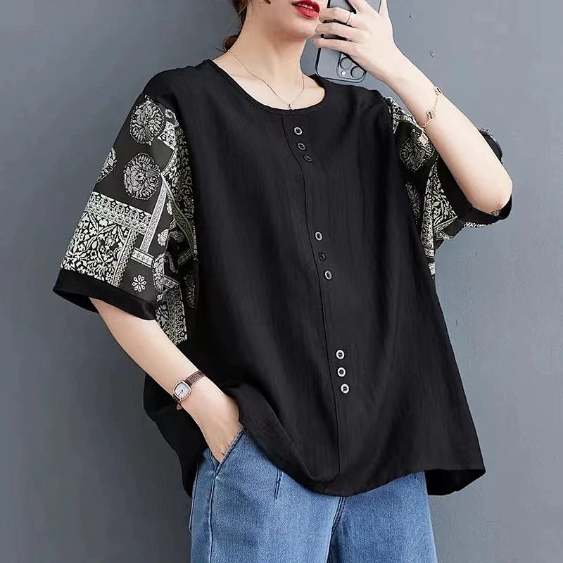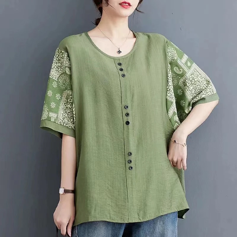 20分鐘前夏季新款棉麻短袖t卹女款寬鬆大尺碼胖mm印花拼接媽媽五分袖純棉上衣 - 買二送二! 僅售 NT$ 1498